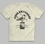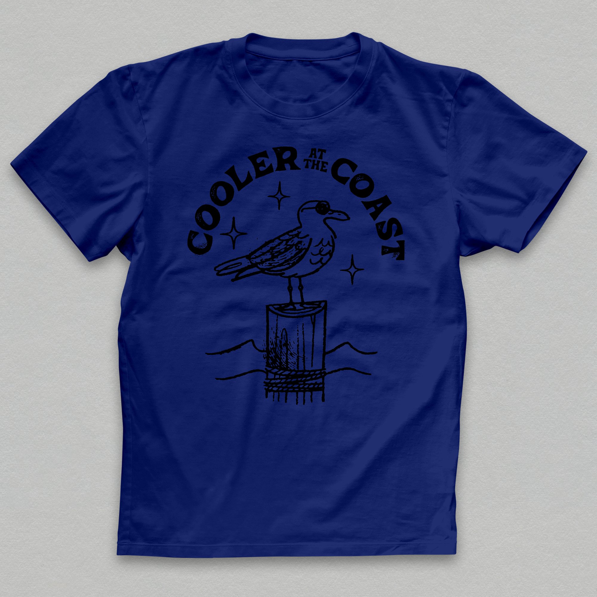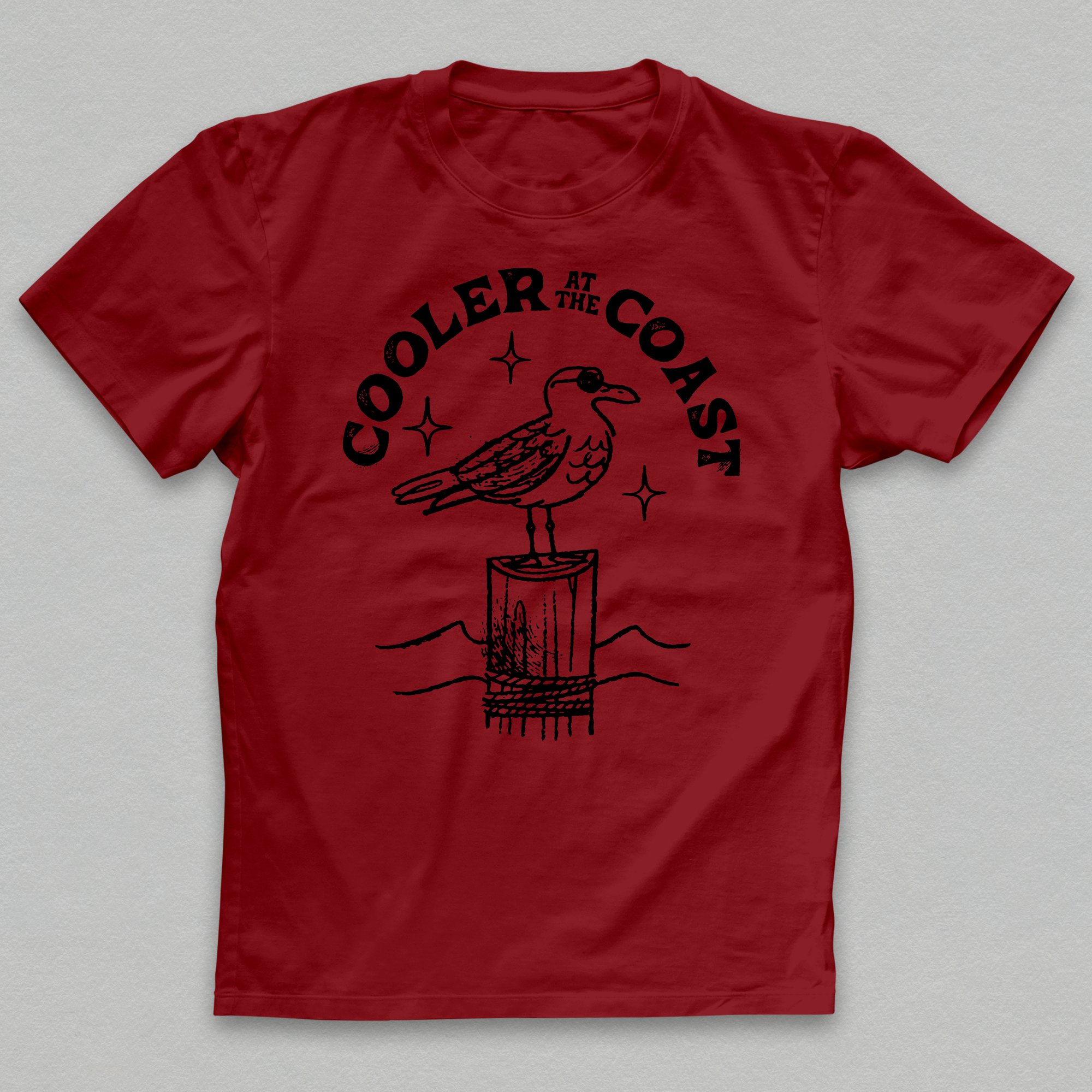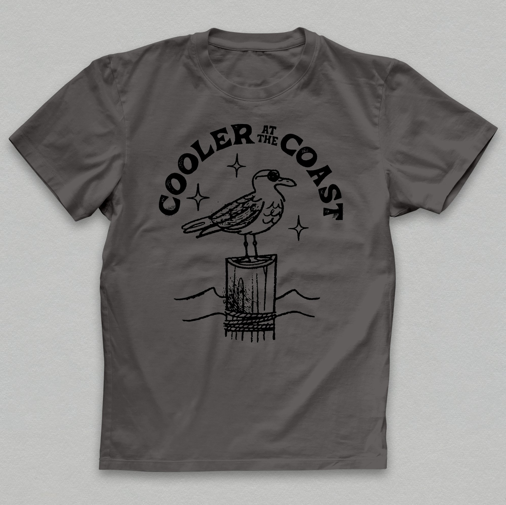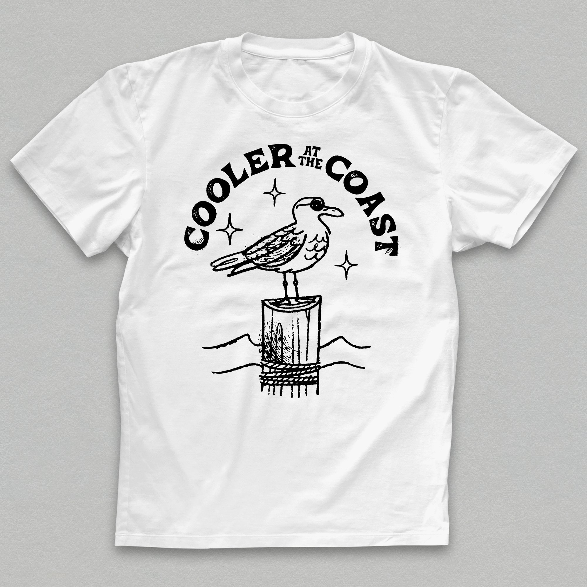 A cotton t-shirt featuring an illustration of an extremely cool seagull, perched on a pier, with the text "Cooler At The Coast" across the top.