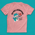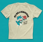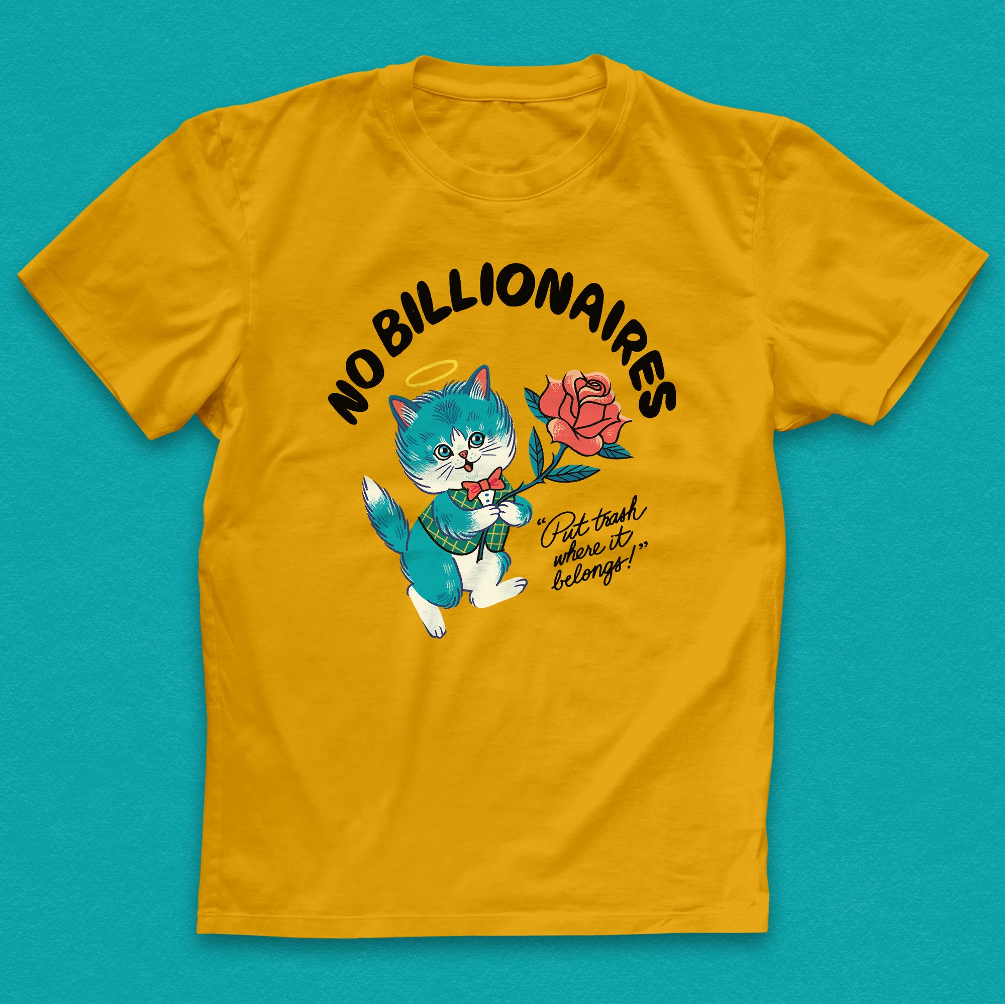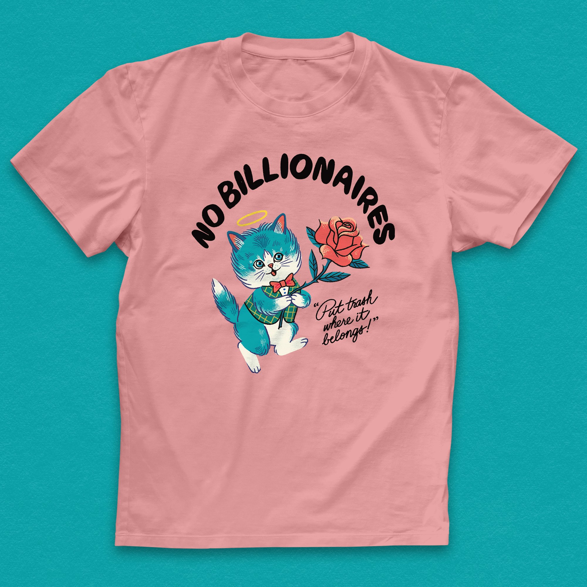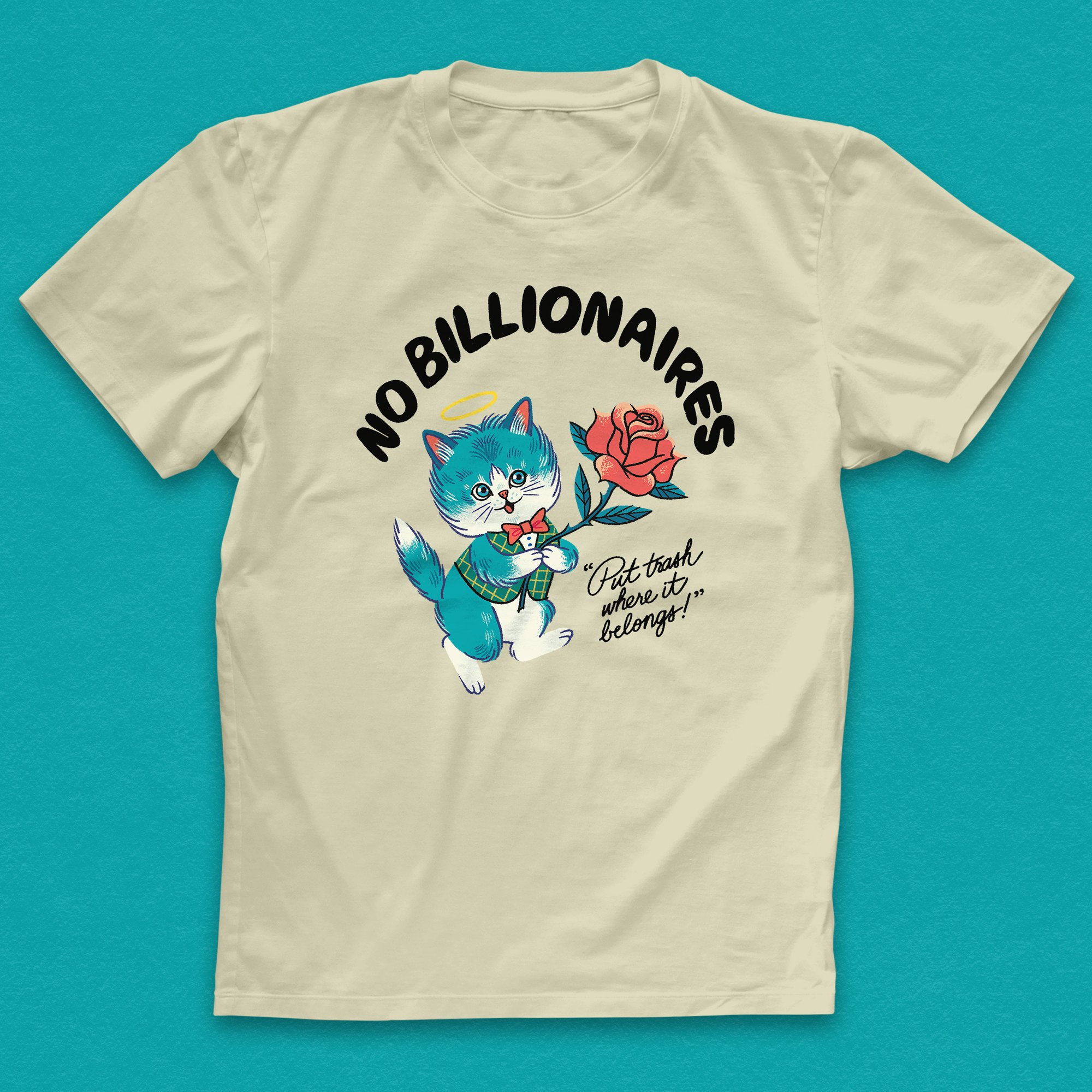 An inspirational cotton t-shirt printed with an illustration of an extra-sweet, extremely polite & fashionable little kitten, holding a beautiful rose, with the text "NO BILLIONAIRES" and "Put trash where it belongs!"